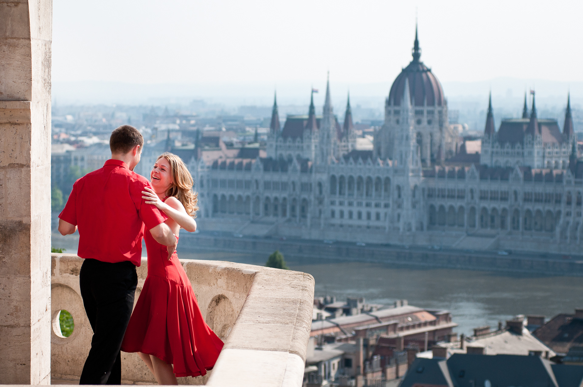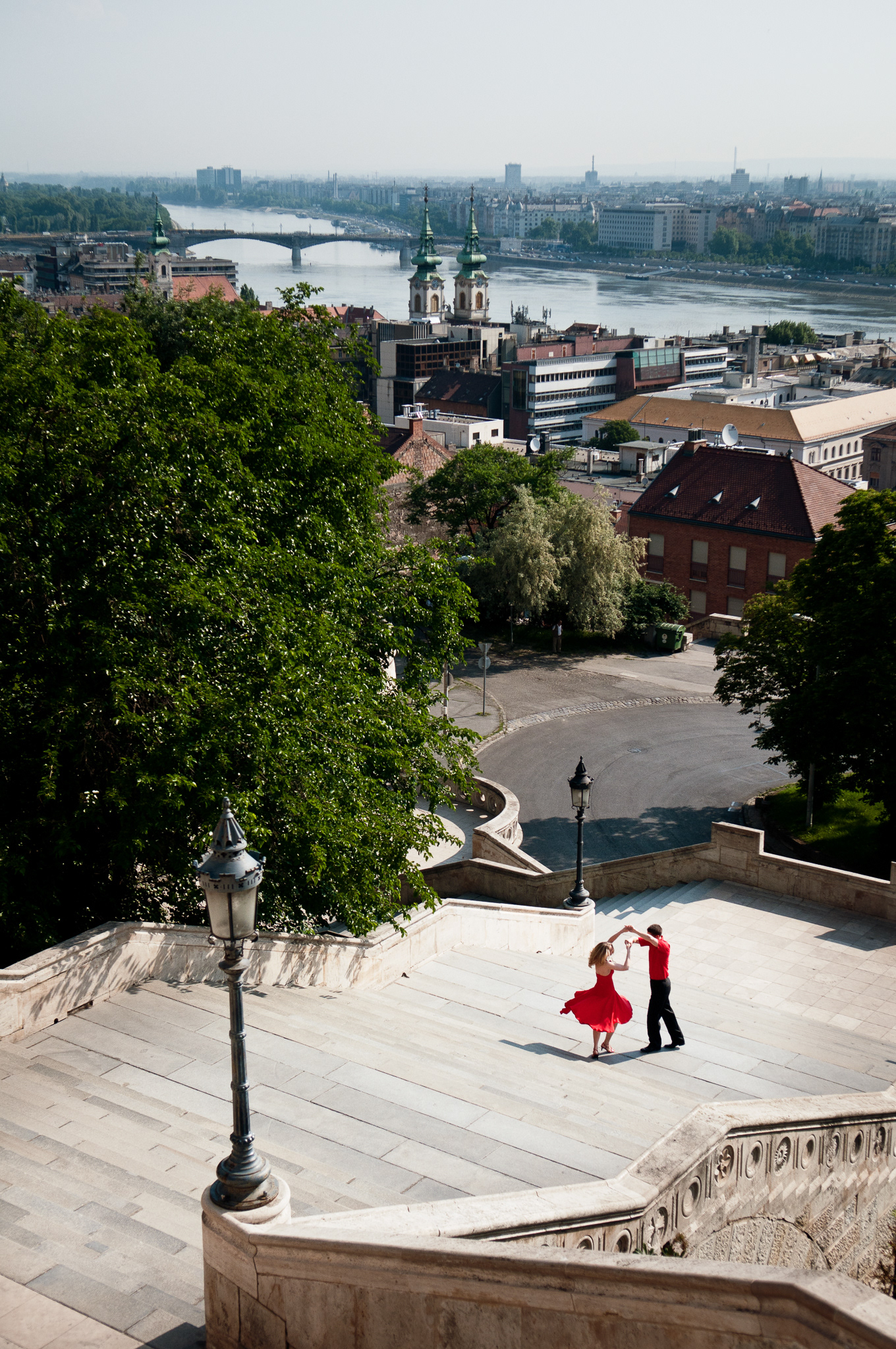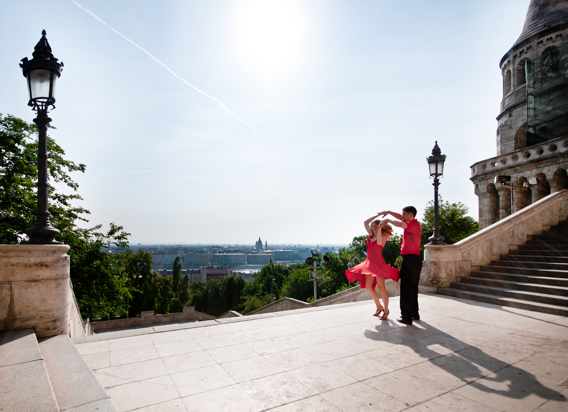 Dance photography - a couple dancing salsa over the (early morning) streets of Budapest, hitting some of the famous spots and views.