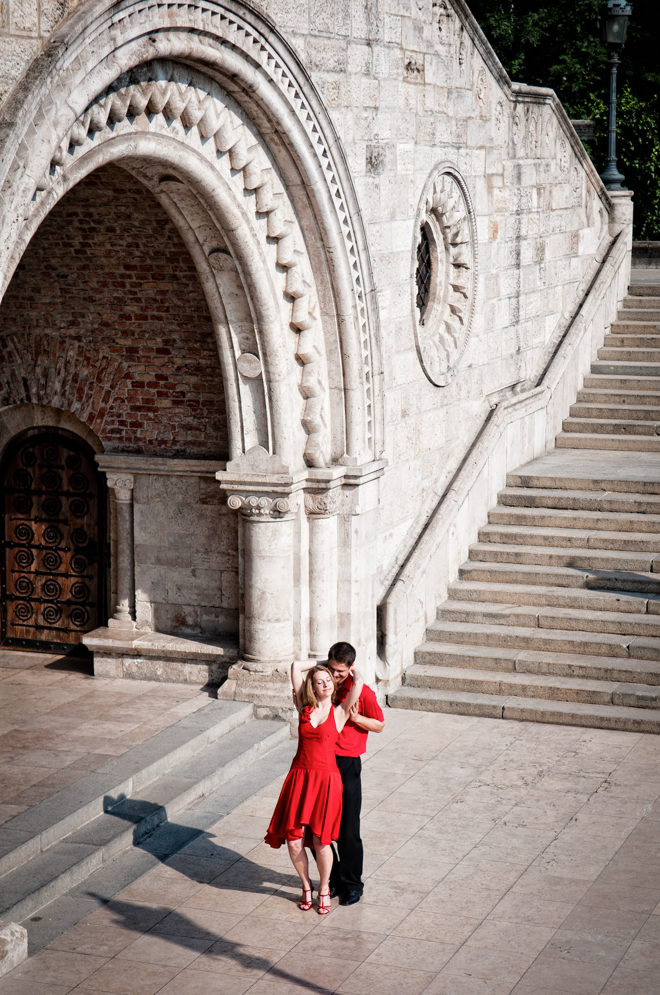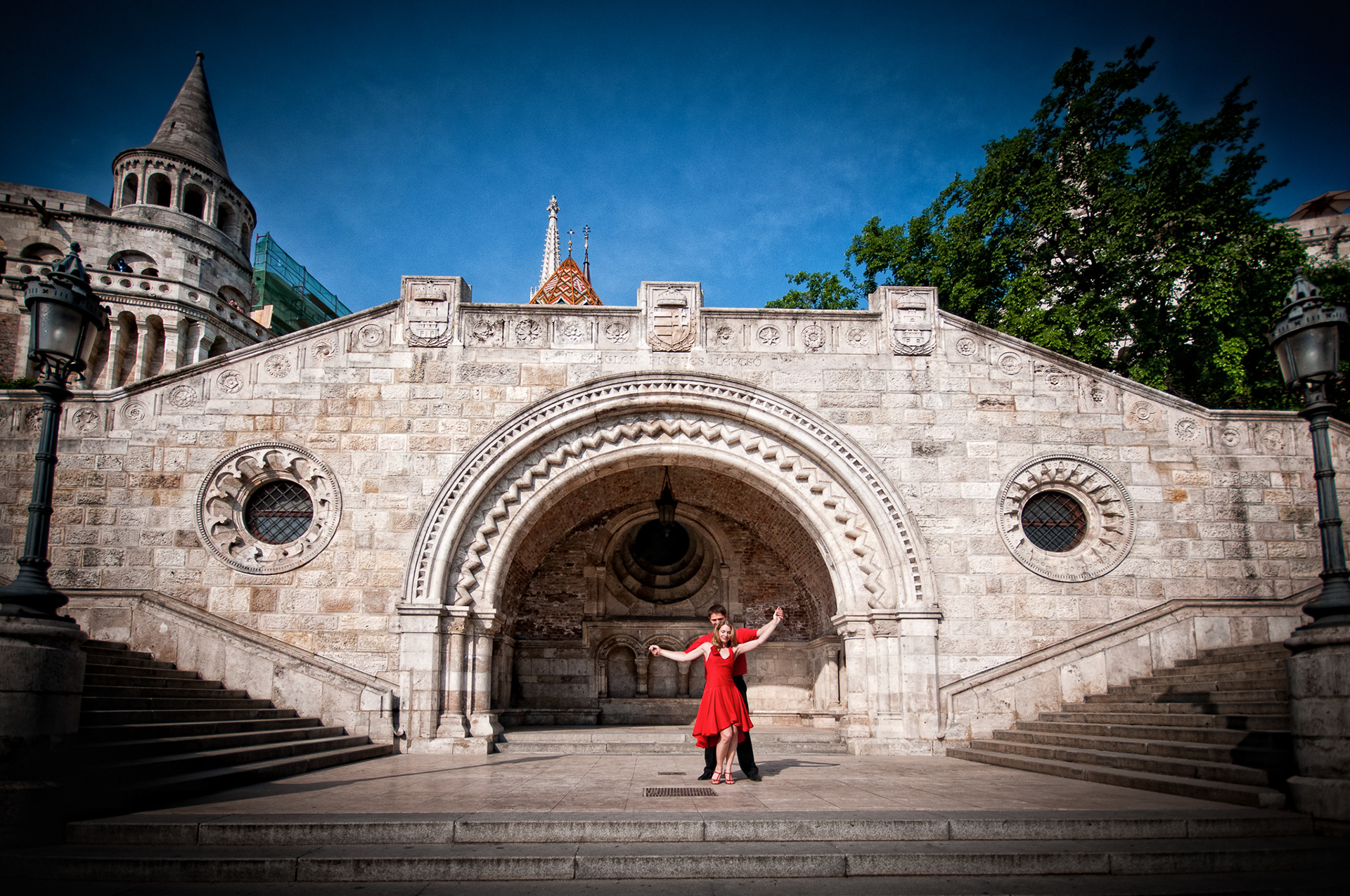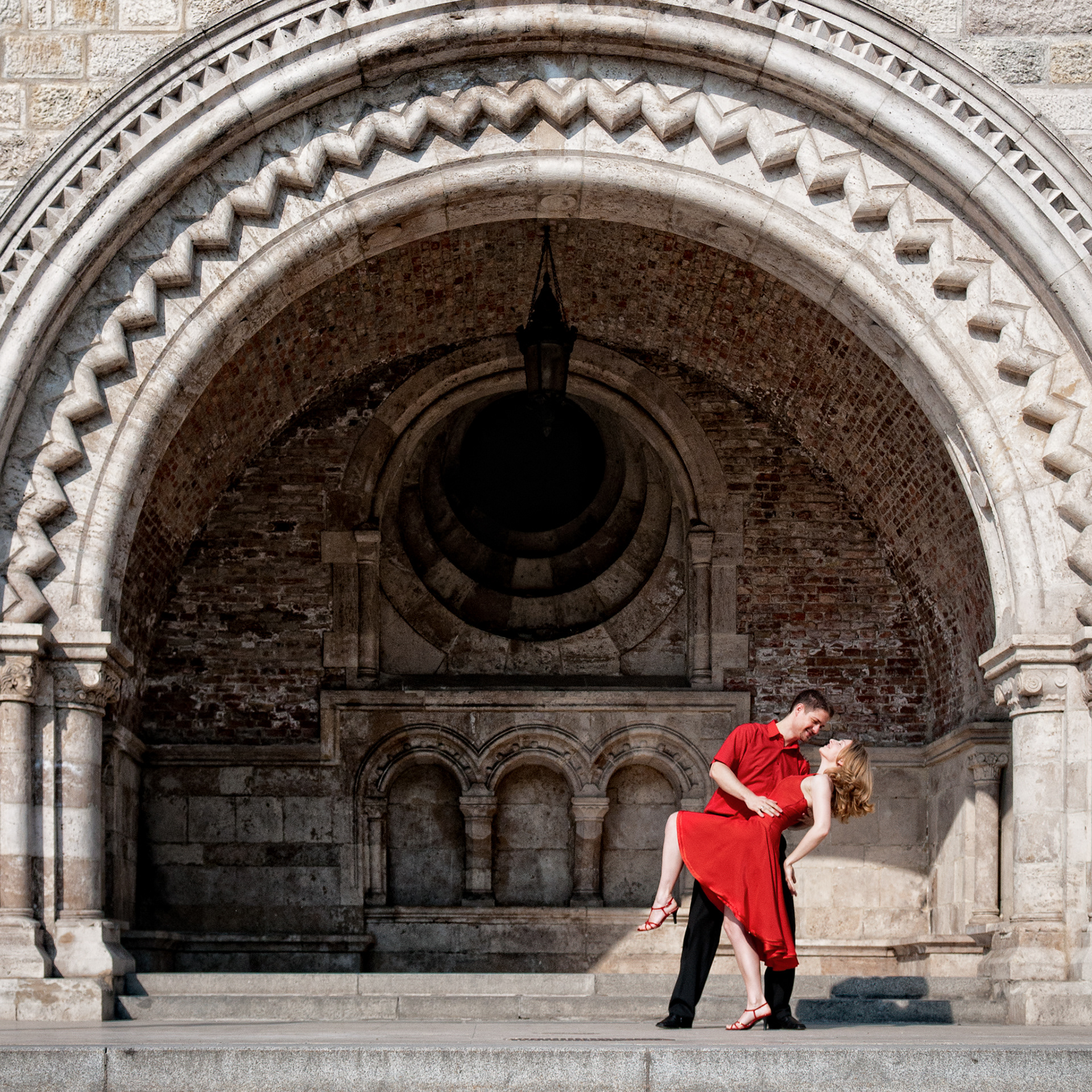 Dance photography - a couple dancing salsa over the (early morning) streets of Budapest, hitting some of the famous spots and views.